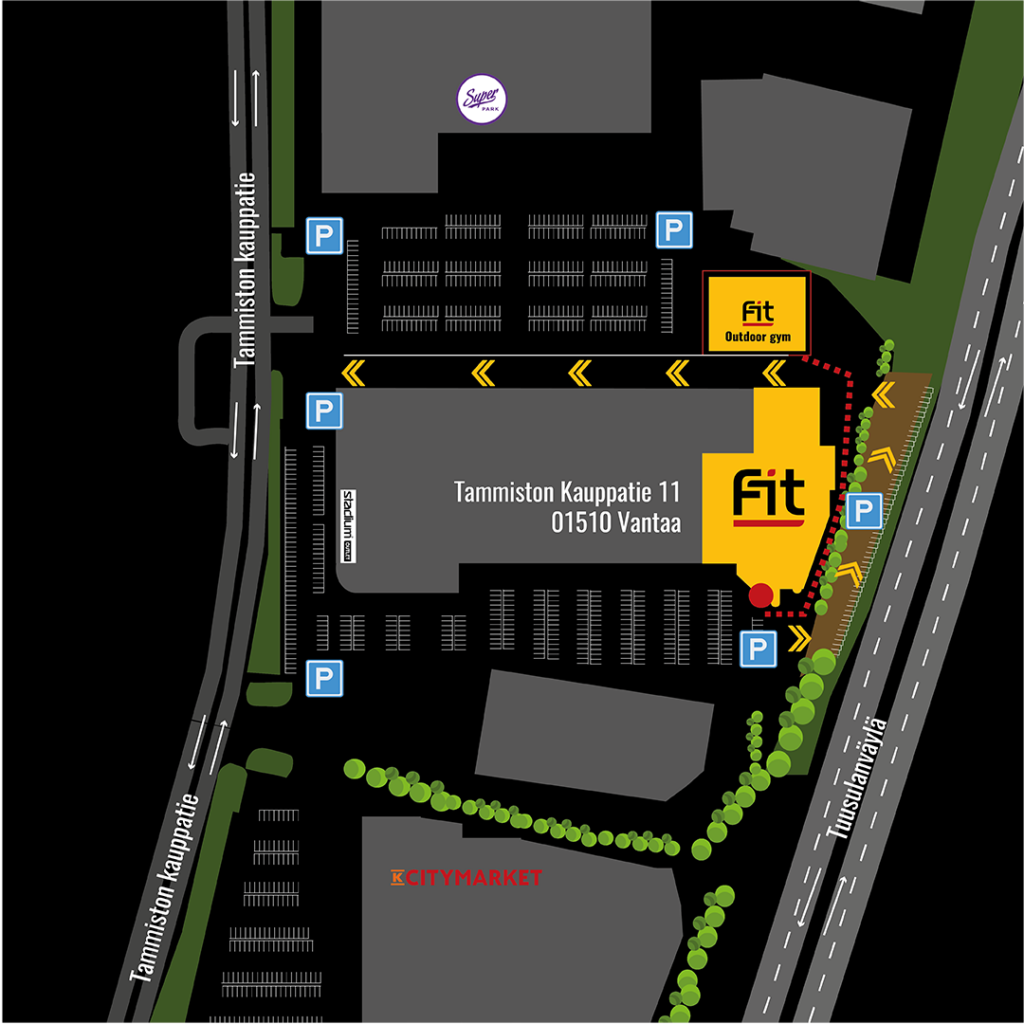 Ruuhka-aikoina arkisin klo 16-19 ja viikonloppuisin klo 10-18 auto kannattaa auto jättää Superparkin parkkipaikalle tai Fit Tammisto Outdoor Gym:n viereen ja kävellä siitä salille 100 m (kts. kartta alla). Ulkosalin vieressä on aina vapaita paikkoja. HUOM. Outdoor Gymin aidan sisäpuolella WC:n taakse tehdään avajaisiin mennessä ovi, josta on vain 100 m salin ovelle, kun kävelet talon Tuusulanväylän puolta ovelle. Pääset kulkemaan ulkosalille samalla koodilla tai kulkukortillasi. Ulkosalin osoite on Tammiston kauppatie 13.